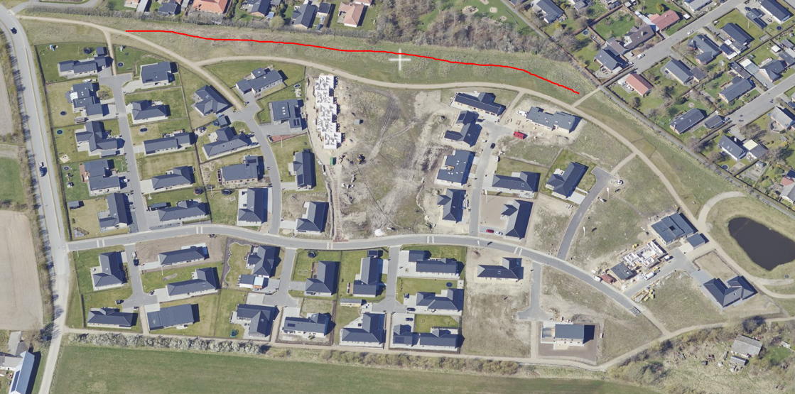 Ambitionerne er store og vi ønsker, på sigt, at lave en junglesti langs vores største, sammenhængende grønne areal (den røde linje). For at teste af hvad der virker bedst, starter vi i mindre skala og arbejder ud fra midten, omkring der hvor rækkehusene er (det hvide kryds). Det gør også at vi får en bedre og mere smidig drift af udearealerne, så vi løbende kan reparere og udskifte, når den tid kommer.